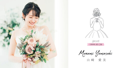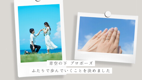 | 写真枚数 | 合計 35〜45枚 新郎様11枚/新婦様11枚/お二人10枚〜20枚/タイトル写真3枚 (お二人パート→1シーンに写真1枚or2枚表示選択可能) |